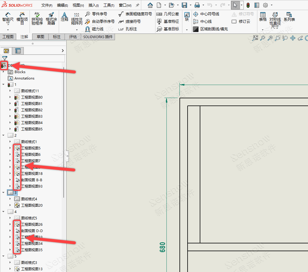 首先拿到客户的图纸文件,可以看到客户同时使用了“分离的工程图”和“多页工程图”,多页工程图易造成数据卡死,或许这是发生问题的原因。后经排查其解决方案也十分简单,在设计树模型视图上对所有包含分离的工程图视图右键菜单 -> “装入模型”,这一步是为了让三维模型加载至内存使其工程图与原三维模型的链接进行关联。